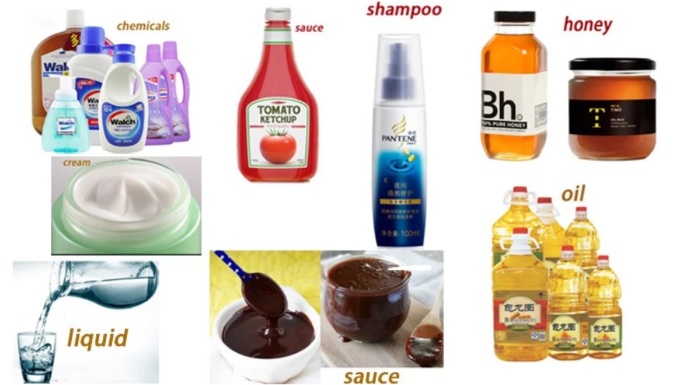 Полу-вискозни и вискозни течности; мачка, сенф, сирупи, салса, мајонез, мед, путер од кикирики, желе, сосови од натопи, мелем за усни, шампон, дебели сапуни, гелови за стајлинг, маски за лице, восок, лепак, маснотии, заптивки, силикон и многу повеќе